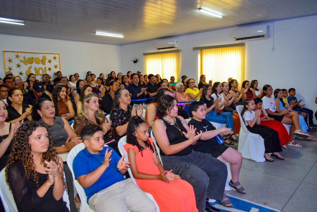 A solenidade contou com a presença de autoridades municipais, entre elas a prefeita Aline Karina, o vice-prefeito Chico, a secretária de Educação Joelinne, a diretora de Ensino Amanda, o presidente da Câmara Municipal, Júnio Moreira, os vereadores Romão e Cleubia, o diretor de Cerimonial e articulador do Selo UNICEF Diego Nunes, além da equipe da Secretaria, professores, diretores e familiares dos alunos.