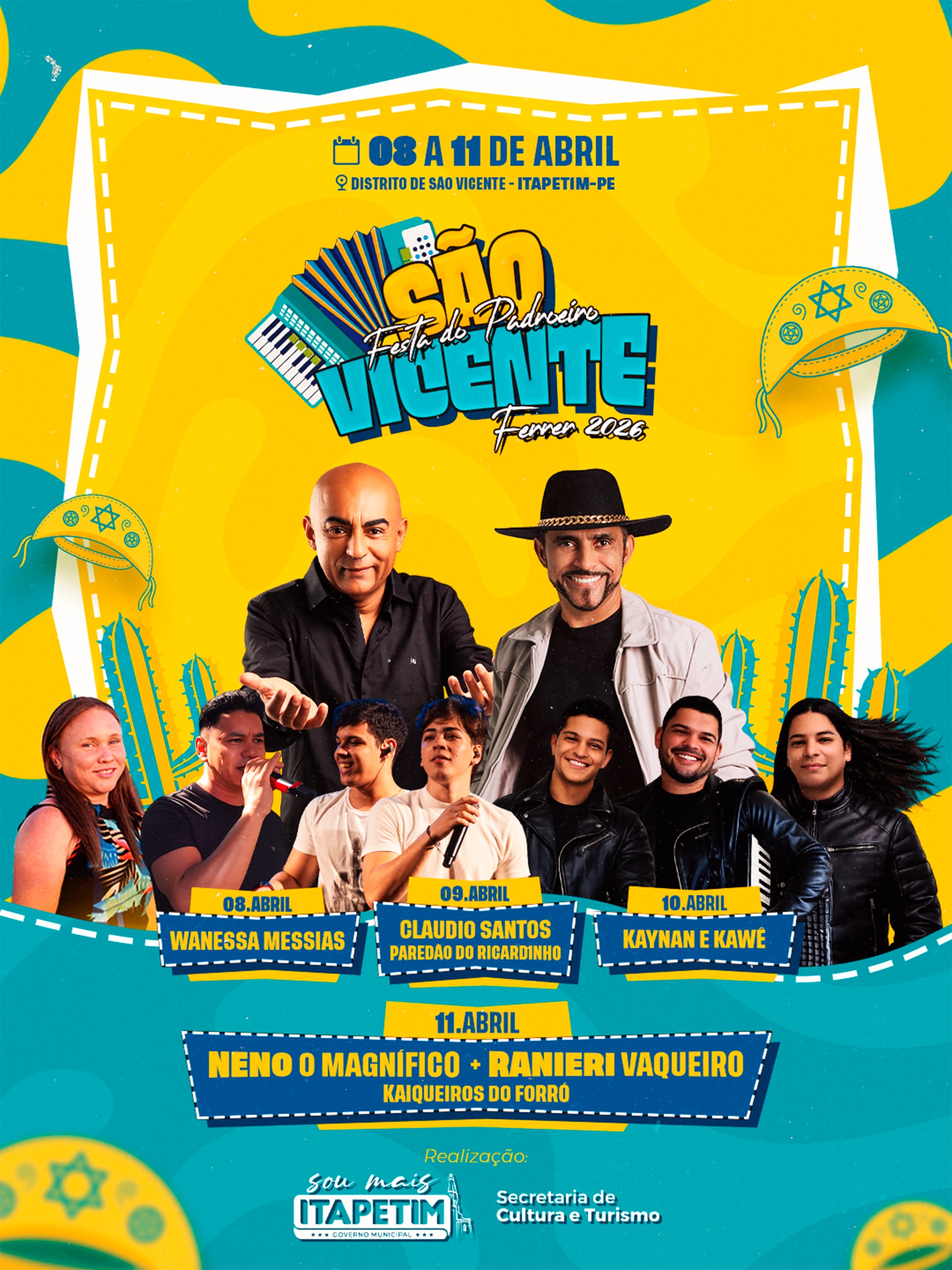 O Governo Municipal de Itapetim (PE) divulgou a programação da tradicional festa em homenagem ao padroeiro São Vicente Ferrer, que será realizada entre os dias 08 e 11 de abril, no Distrito de São Vicente. O evento faz parte do calendário cultural do município e contará com apresentações musicais em praça pública ao longo dos [...]Leia mais...
